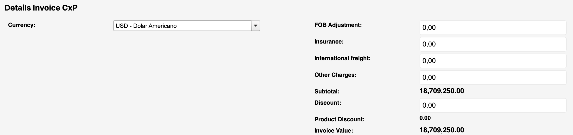 Document type: Defines the type of commercial document: Invoice CxP (Commercial Invoice) in this case.